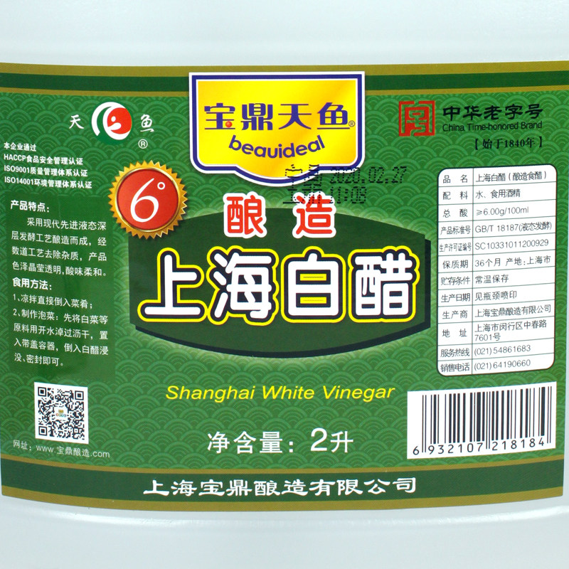 Upper Baoding White Vinegar 2L* 1 Barrel Fit 6 Degrees Edible White Vinegar Sauerkraut Cold Mixed Vinegar Domestic Bubble Foot Germicidal Decontamination