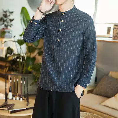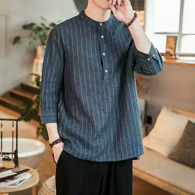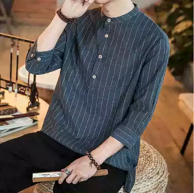 Summer Chinese style striped cotton linen men's loose short sleeve top Half sleeve shirt large size linen seven-point sleeve shirt