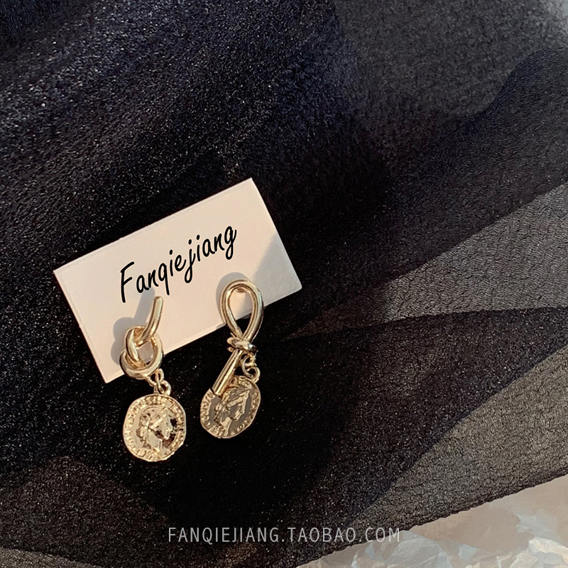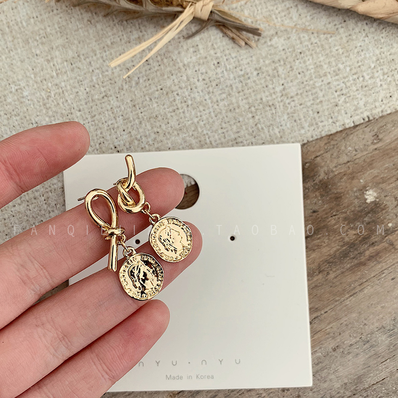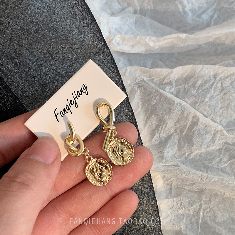 Advanced Sensation Retro Gold Coins Portrait Earrings Woman 925 Silver Needle Knotted Asymmetric Ear Pin 2021 New Tide Niche