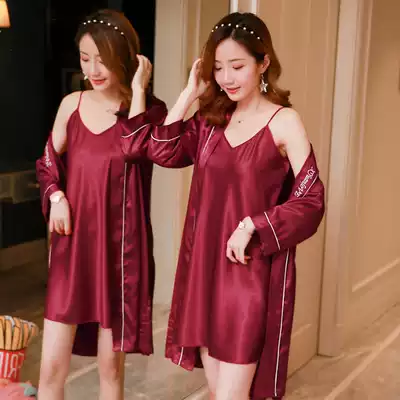 Spring and Autumn Pajamas Women's Summer Thin Sexy Sling Ice Silk Korean Two-Piece Nightdress Sexy Nightgown Home Clothes