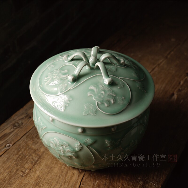Jin Yirui handmade lid pot Longquan celadon ceramics collection living room decoration tea pot large peony lid pot