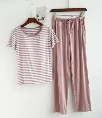 With chest pad bra pajamas ladies spring summer modal thin large size striped short sleeve trousers home suit suit