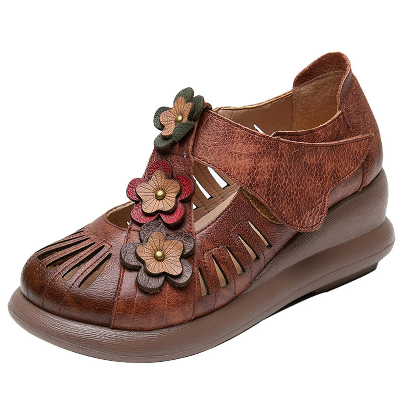 New Genuine Leather Elegant National Wind Flowers Round Head Women's Shoes Thick bottom pine pastry heel Hollowed-out Cave Shoes with sandal women