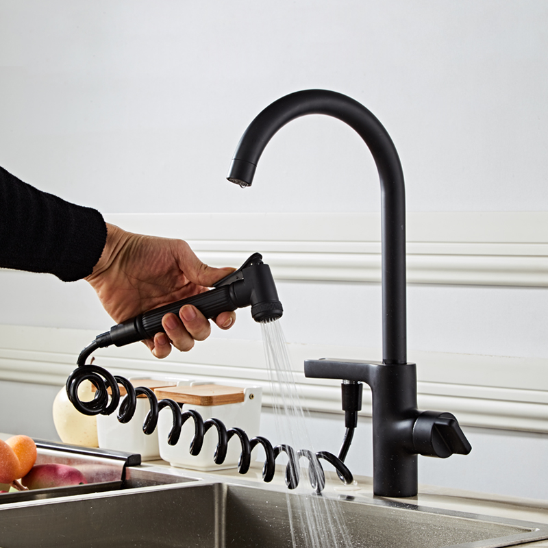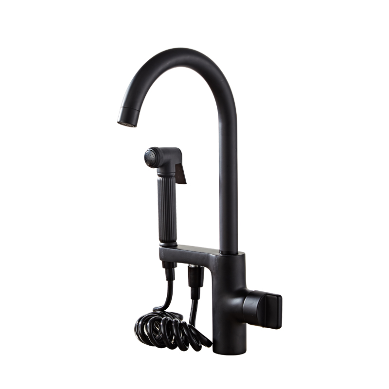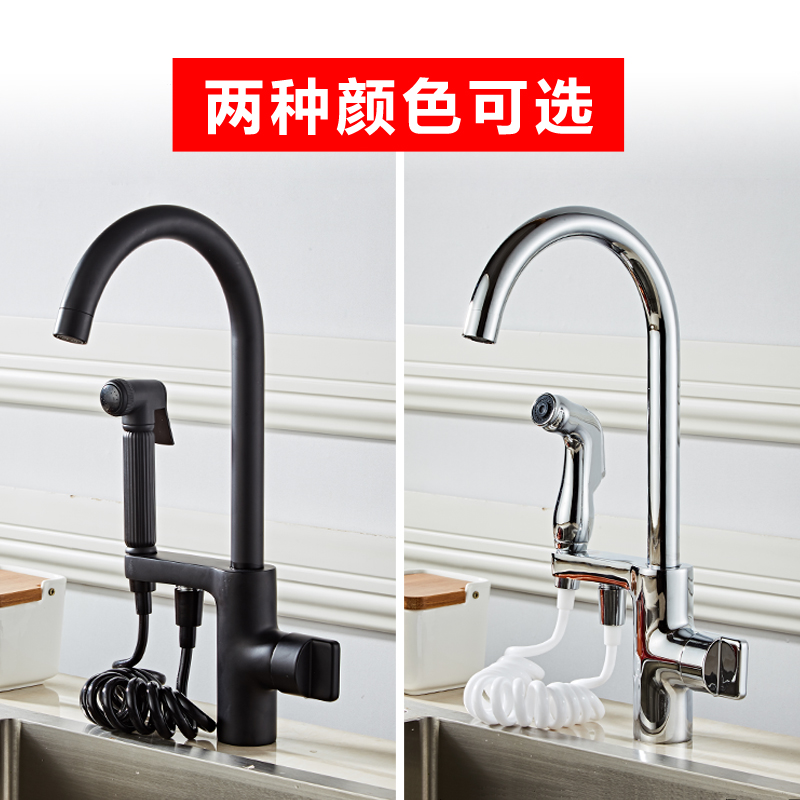 Kitchen hot and cold water faucet European-style all-copper black with spray gun wash basin basin dual-use 360-degree rotating faucet