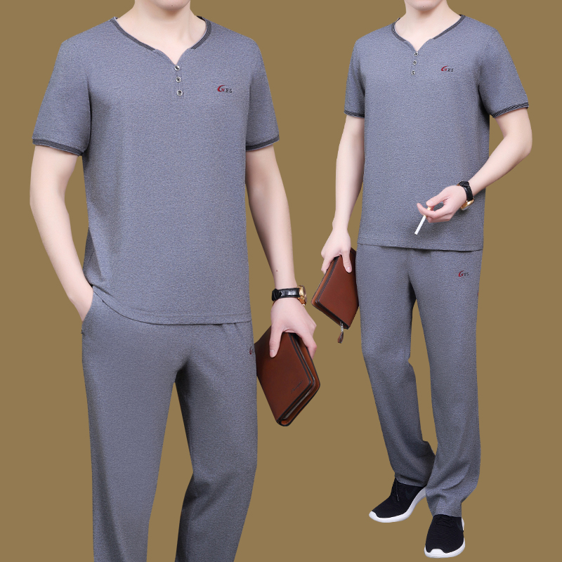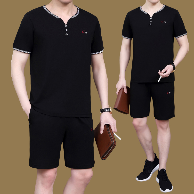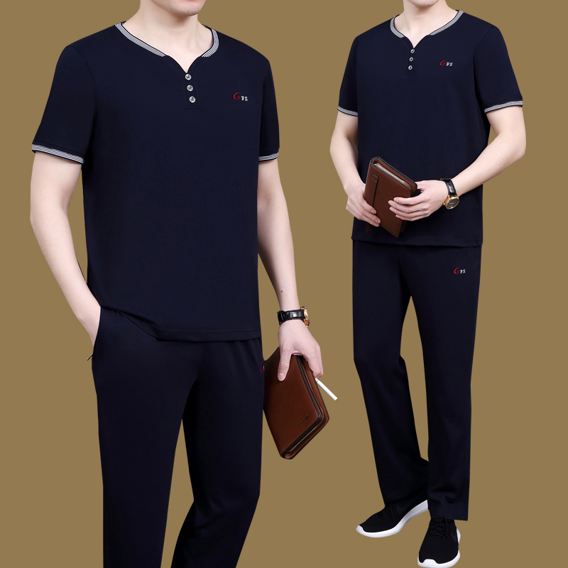 Summer middle-aged men short-sleeved trousers V-collar cotton loose running middle-aged dad sportswear suit men