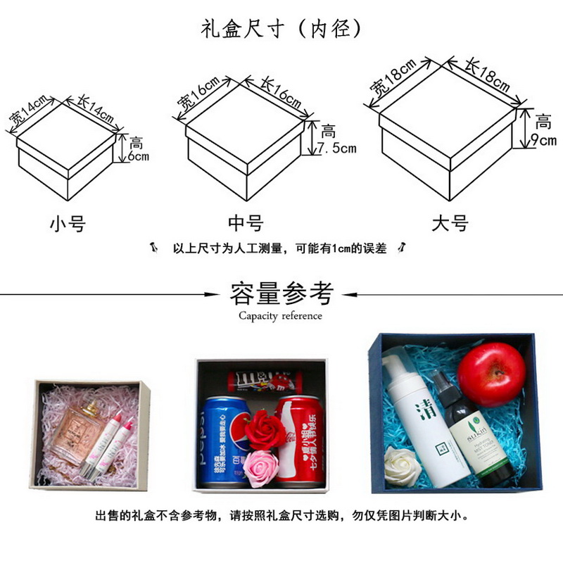 14*14 * 6cm small (can hold lipstick 1-3 perfume 30-50ml hairpin jewelry) 16*16*7 5cm medium (can hold short clip 2 cans of cola) 1