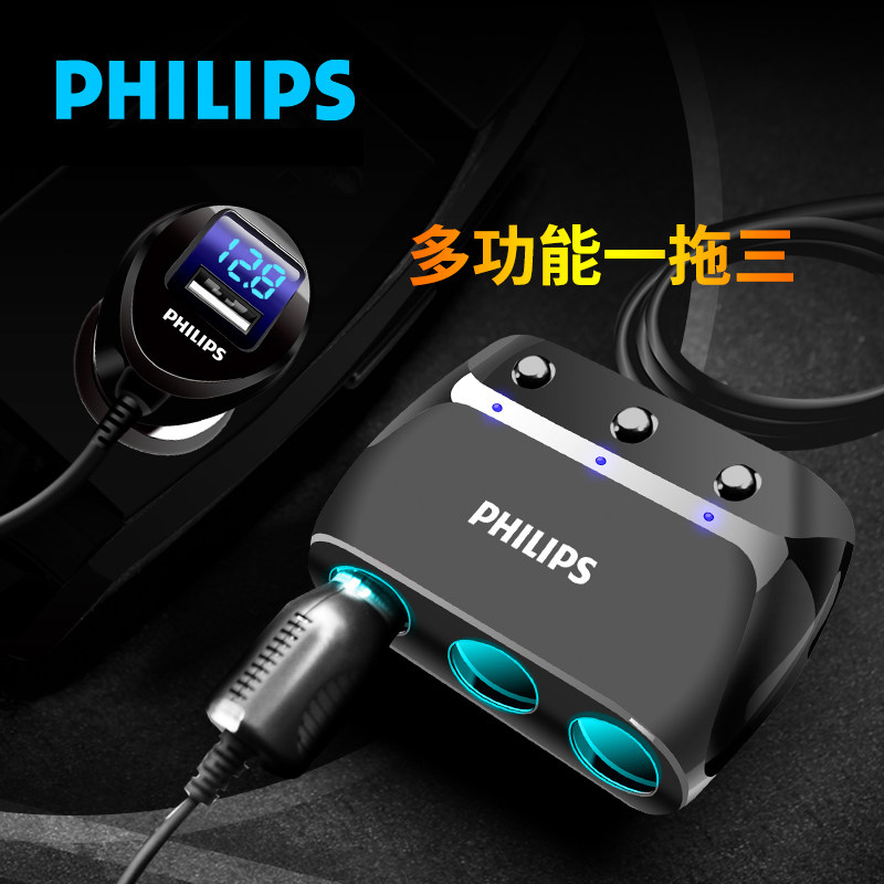 Philips car charger one drag three cigarette lighter with switch usb car multifunctional car charger DLP2019