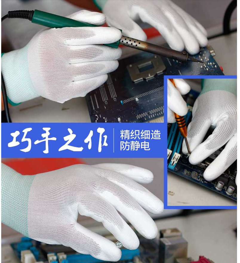Thickness and anti-static white nylon PU fingercoated palm-coated gloves Labor wear resistance and anti-static dust-free breathless immersion and anti-slip