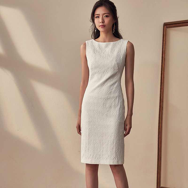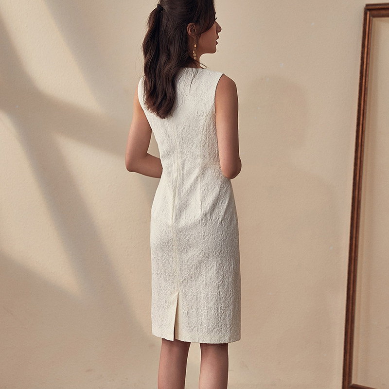 Luo Yi classic professional commuter OL white collar sleeveless dress new intellectual solid color slim mid-length dress 7055