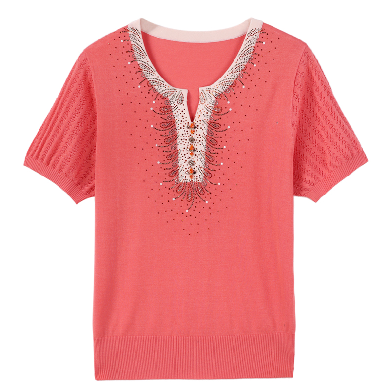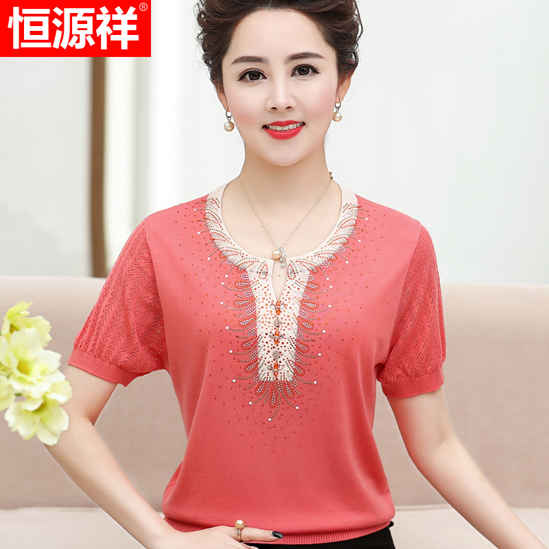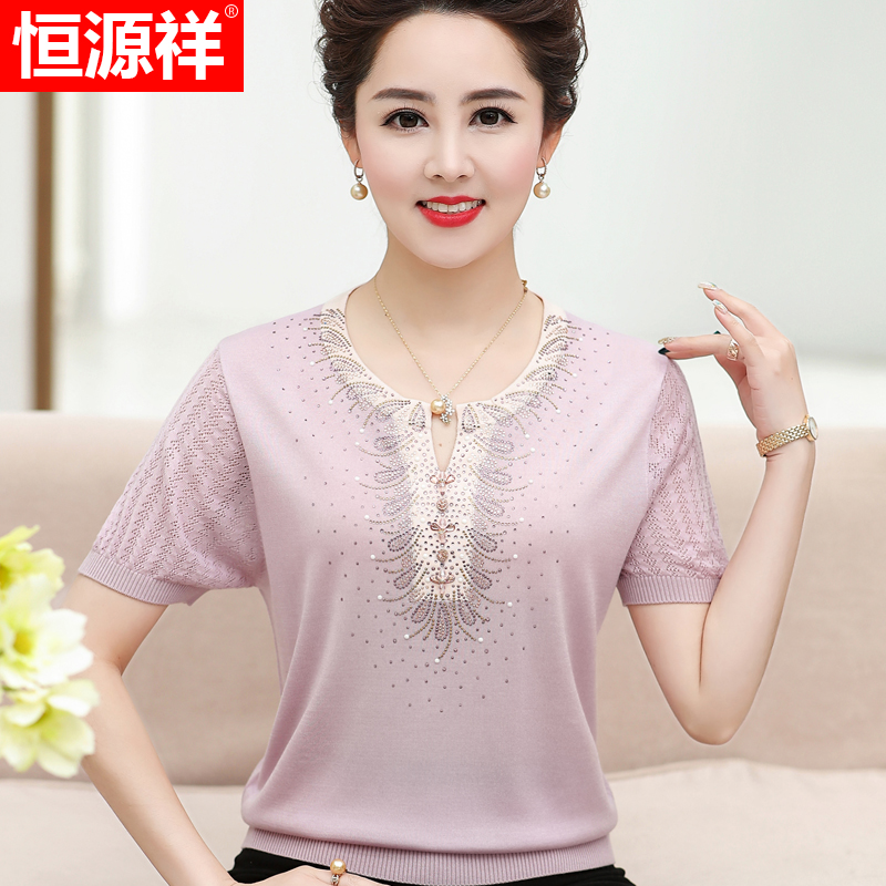 Hengyuan Xiang Fat Mother Summer Clothing T-shirt Middle Aged Girl Ice Silk Short Sleeve Gats Plus Fat Increase Code Stitch Sweatshirt Thin blouse