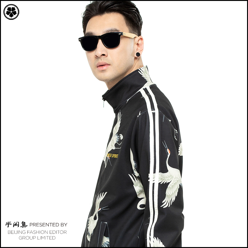 Semi-leisure collection Chinese style sports jacket black crane print autumn new coat fashion trend hip-hop men's clothing