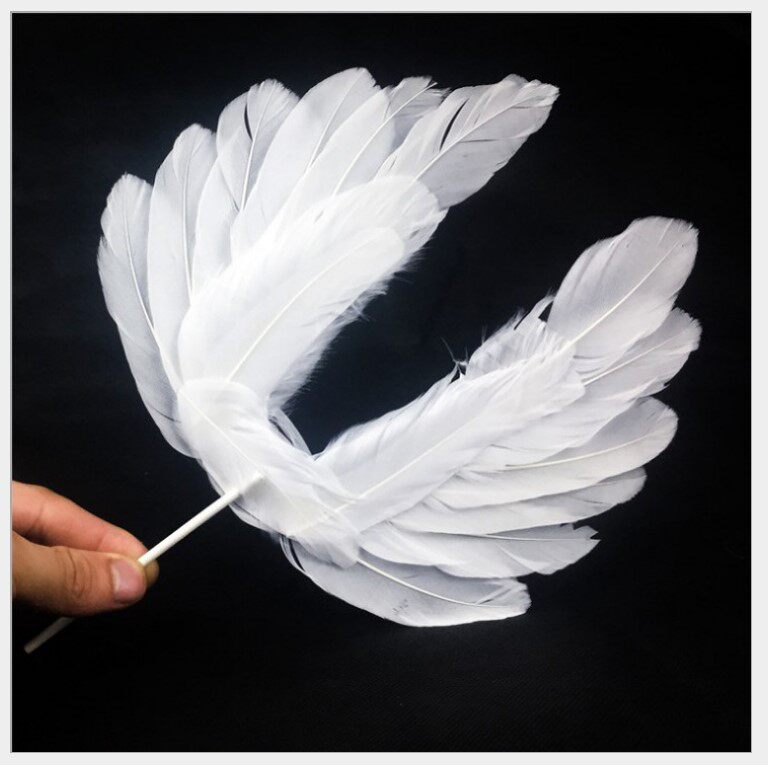 White, black and white wings, 5 white wings, 10 white heart-shaped feathers, 5 pink heart-shaped feathers, 5 black heart-shaped feathers, 5 colored heart-shaped feathers, 5 single ostrich feathers, 10 cotton