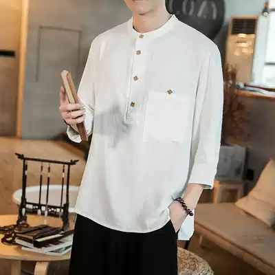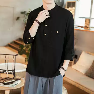 Linen short-sleeved shirt men's stand collar casual 7-cent sleeve Korean trend loose large size T-shirt Chinese style inch shirt