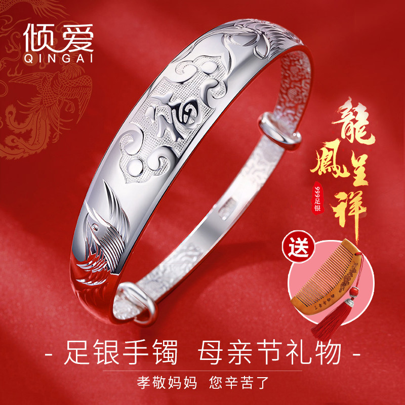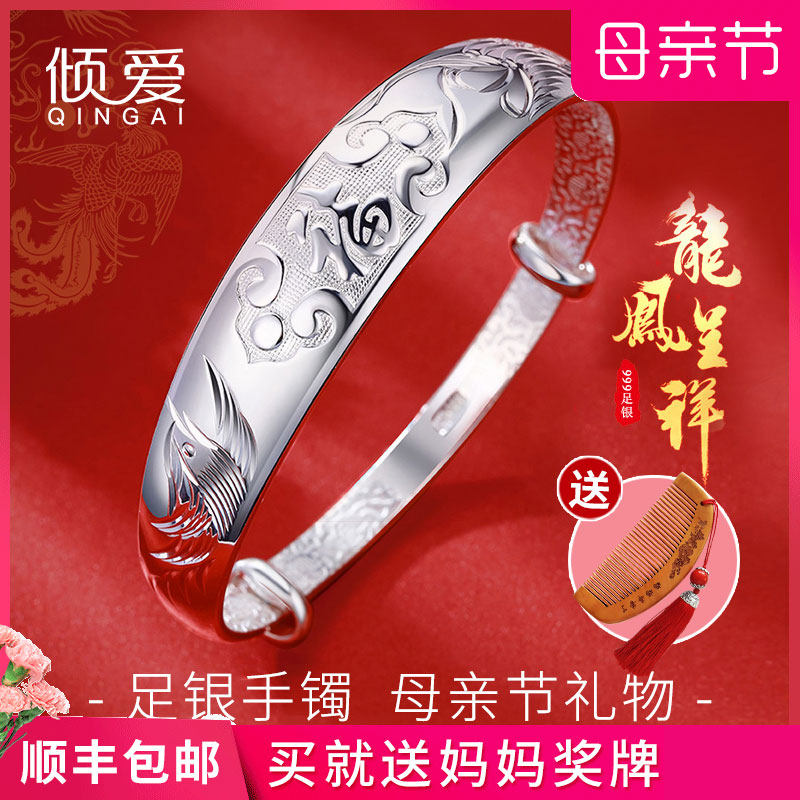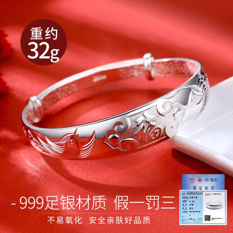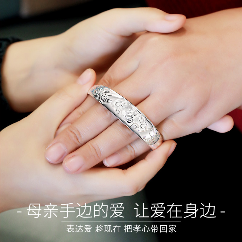 Silver bracelet female 999 sterling silver solid foot silver blessing word elderly vegetarian silver bracelet to send Mom and Grandma Mid-Autumn Festival gift