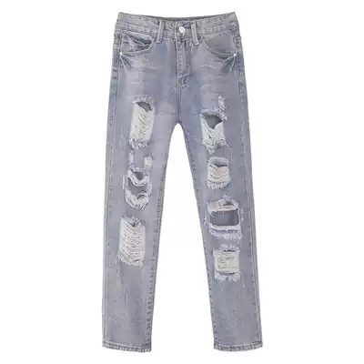 2021 Autumn New Net red thin waist high waist hole jeans women loose straight pants nine points Haren pants tide