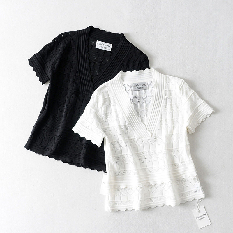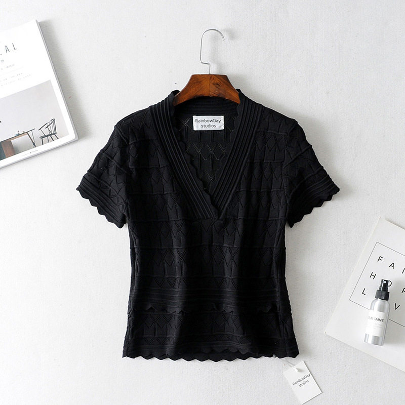 Foreign trade counter tail goods cut tail single special price hollow V-neck knitted short-sleeved women's summer T-shirt