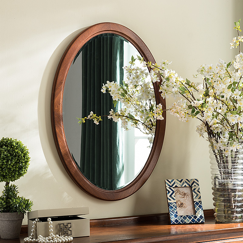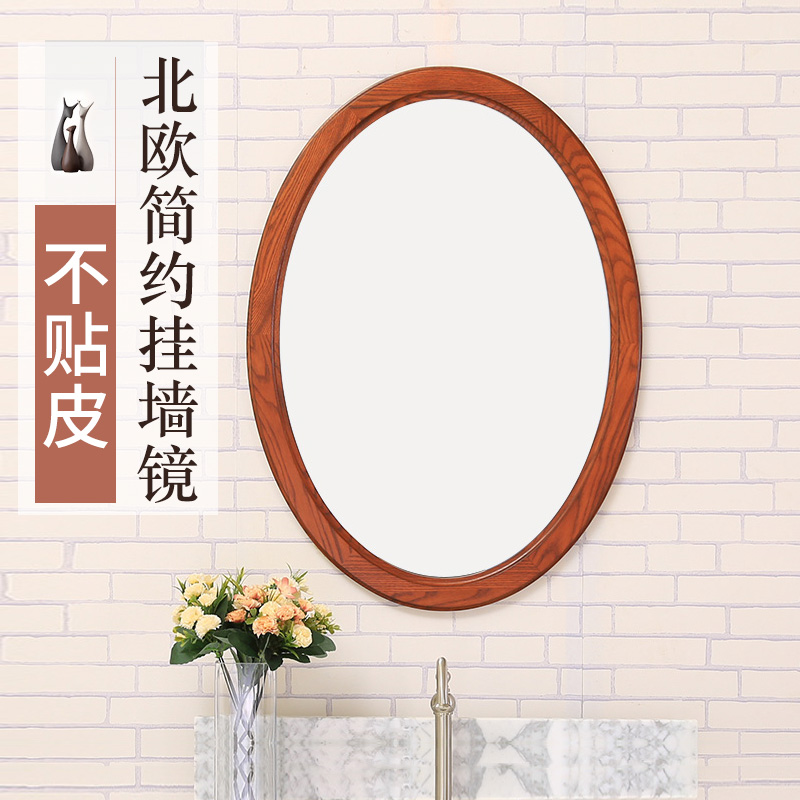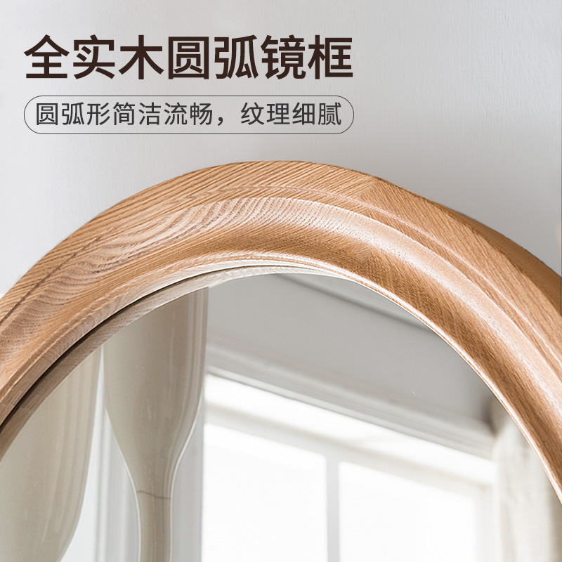 Nordic ins wind bathroom wall-mounted mirror Full solid wood household round mirror makeup mirror Makeup mirror round wall-mounted mirror