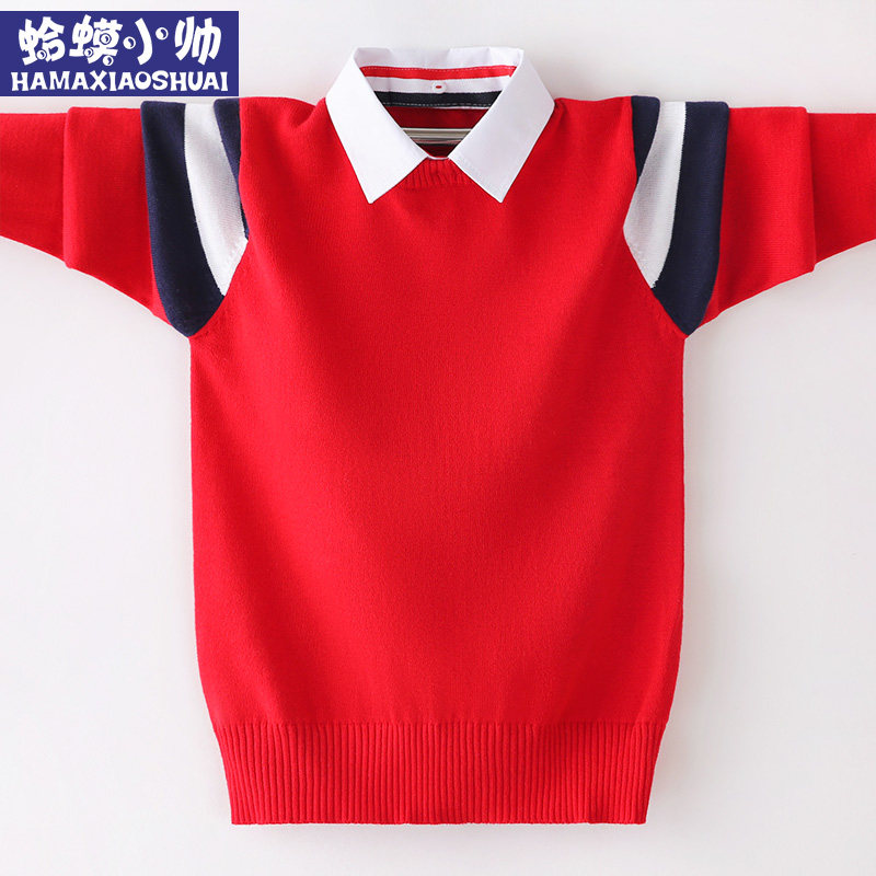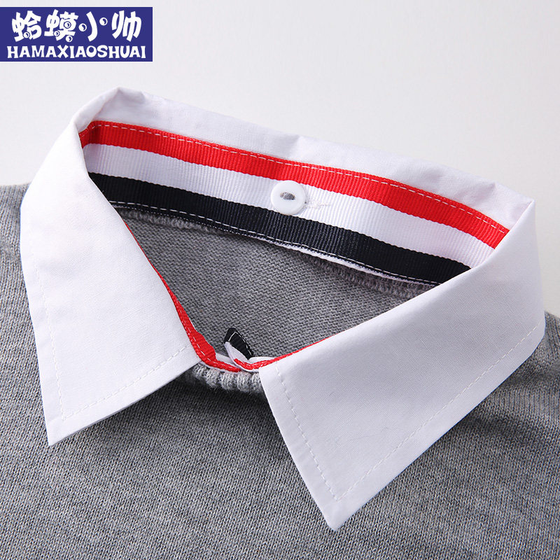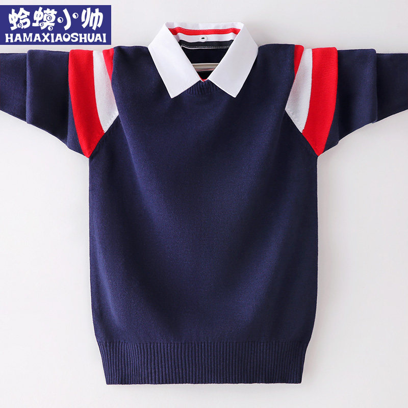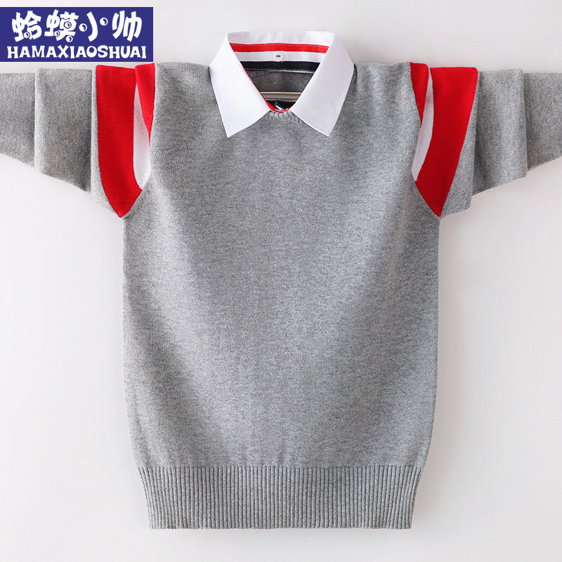 Boy sweater jacket head autumn and winter style Gardown thickened large child-knit cardiovert child boy shirt collar fake two sanitary clothes