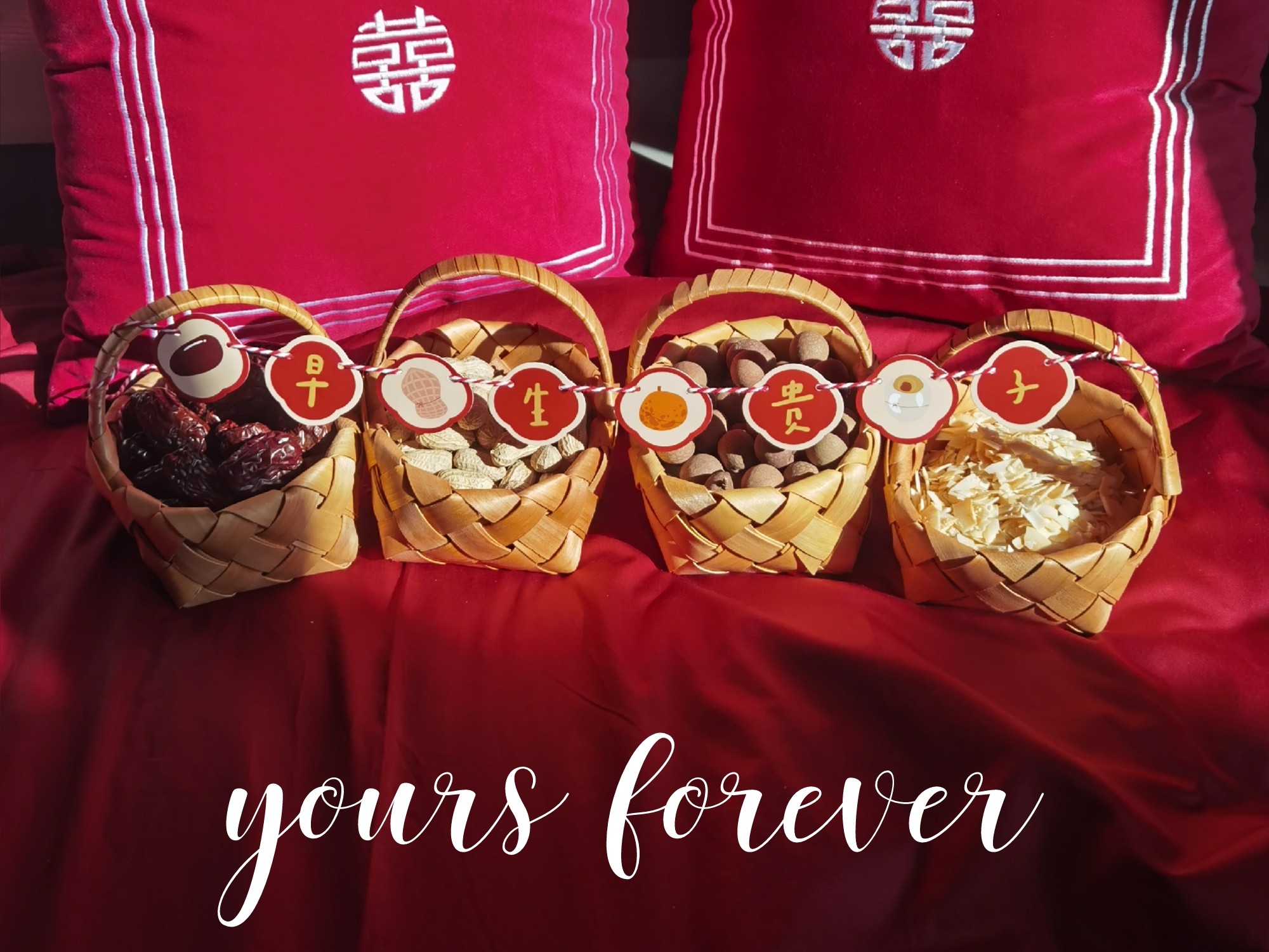 yours forever Chinese ins wedding room layout bamboo basket pull flag pillow Xiaoxizi Xiaohongshu wedding decoration