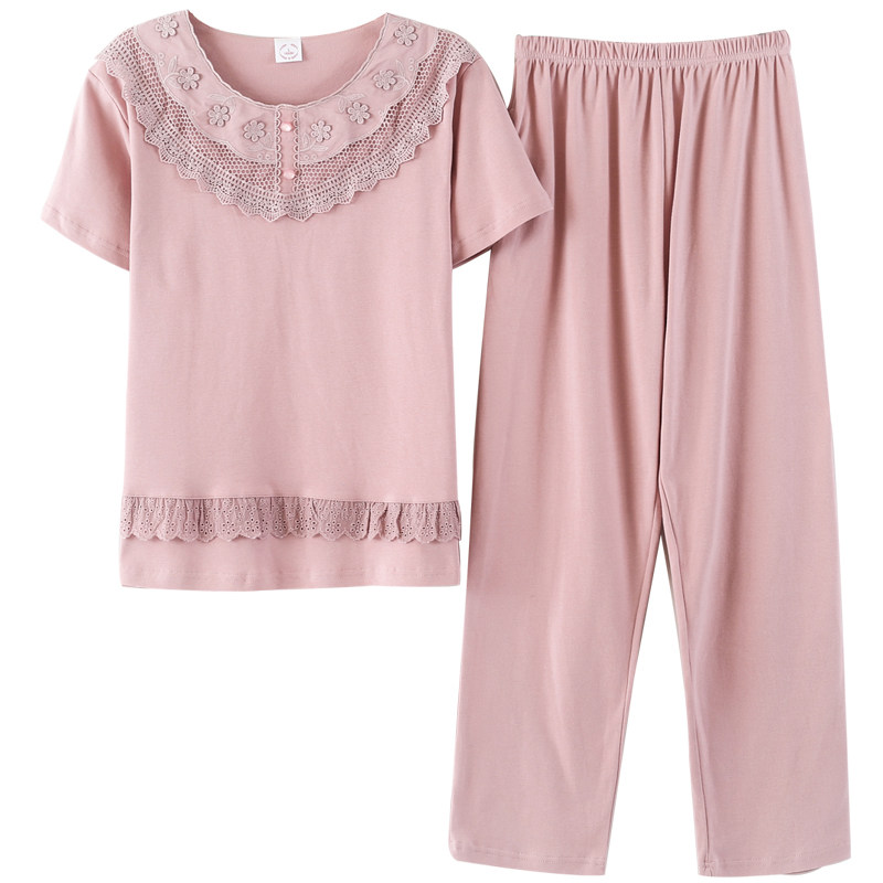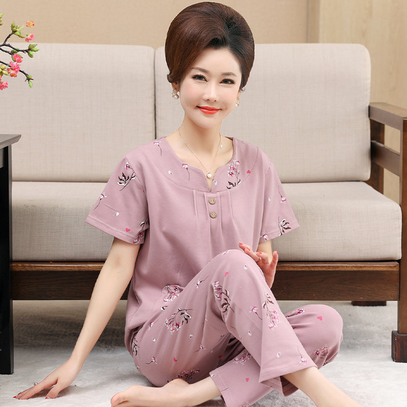 Middle Aged Lady Summer Pure Cotton Pyjamas Elderly Mother Mother-In-Law Short Sleeve Long Pants Plus Fattening Overweight family clothes