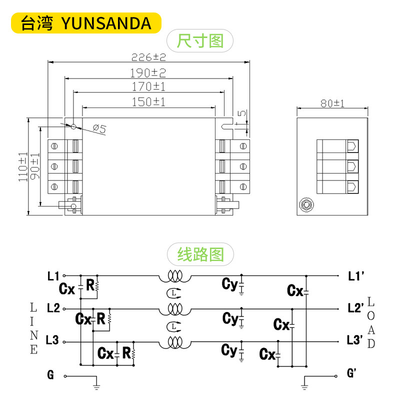 YUNSANDA power filter CW6B-50A 150A-R terminal stage EMI harmonic three-phase 3-wire 380V