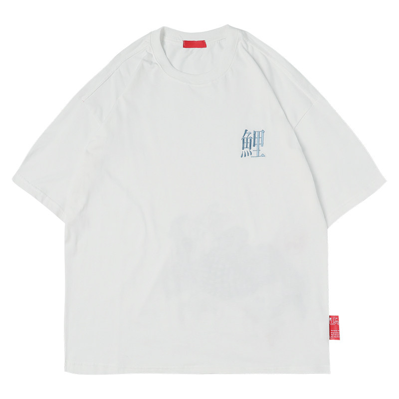 Japanese Ukiyo-e koi fish embroidery T-shirt hipster men and women personality couple wear short-sleeved loose literary T-shirt summer