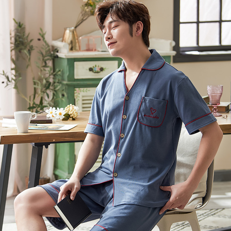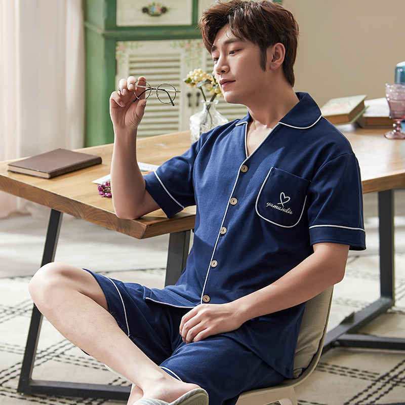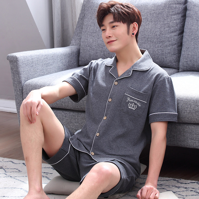 Pajamas men's summer cotton short-sleeved shorts suit lapel suit men's home clothes thin spring and autumn days can be worn outside