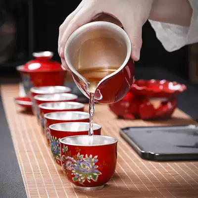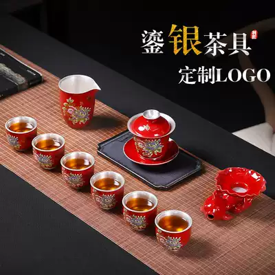 Lijiang 999 sterling silver tea set set Enamel color ceramic handmade gilt silver set Kung Fu tea set household cover bowl