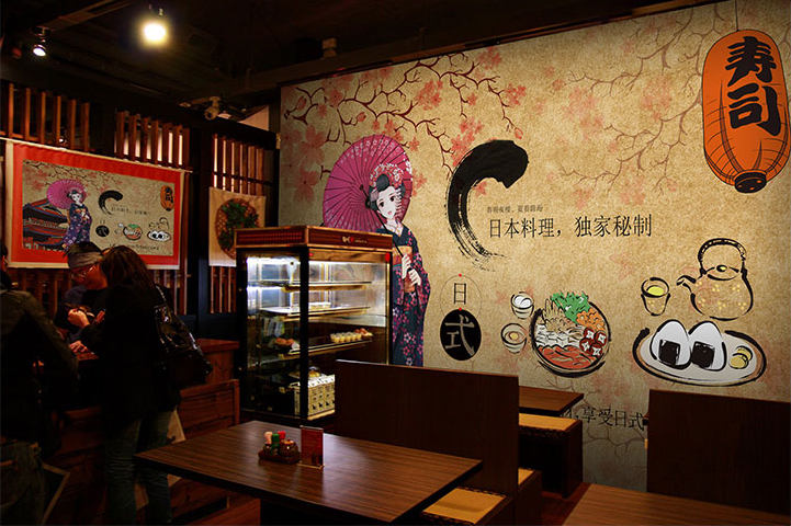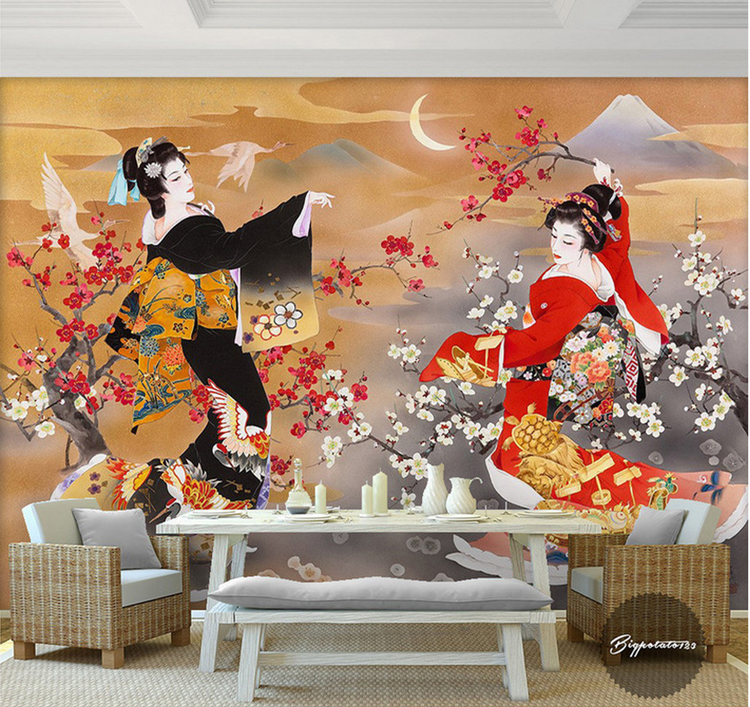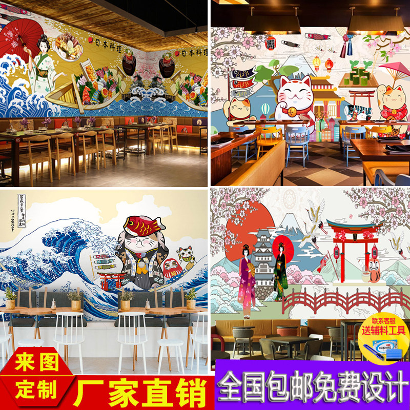 Japanese ukiyo-e lady 3d stereo wall stickers retro dining room hotel lucky cat wallpaper cooking sushi restaurant stickers