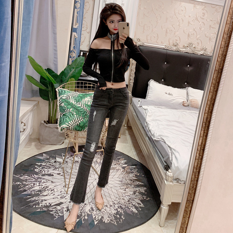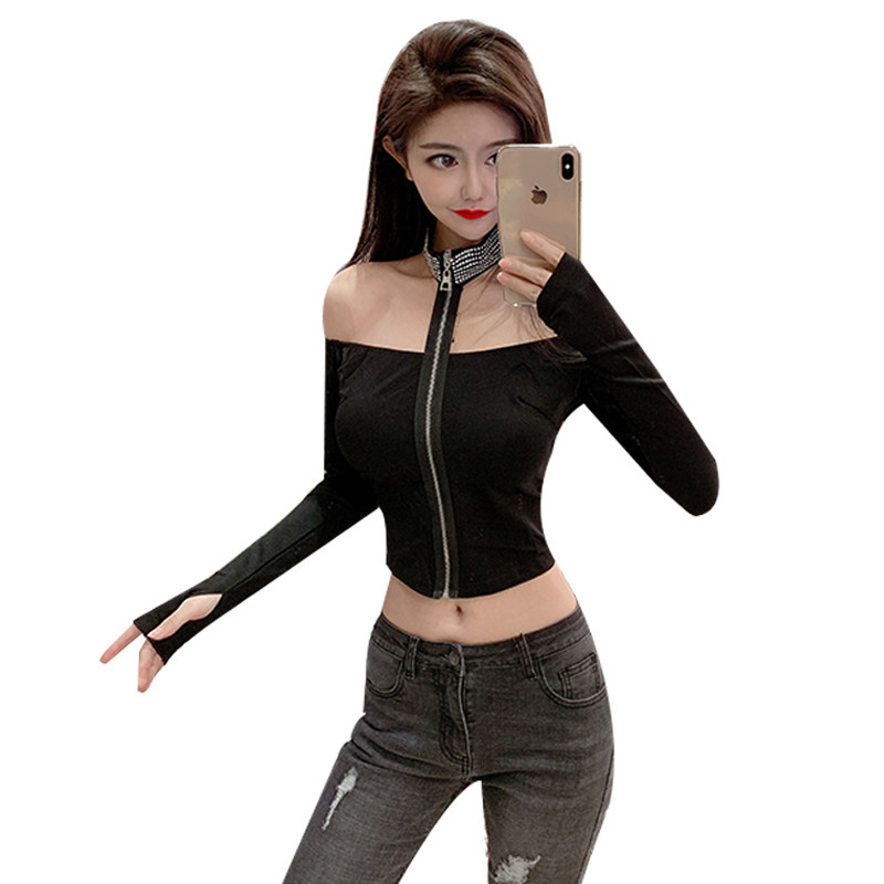 Gege's sexy and careful machine one-word collar hanging neck off-shoulder long-sleeved self-cultivation night show bottoming hot drill T-shirt top women