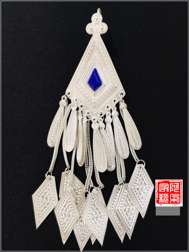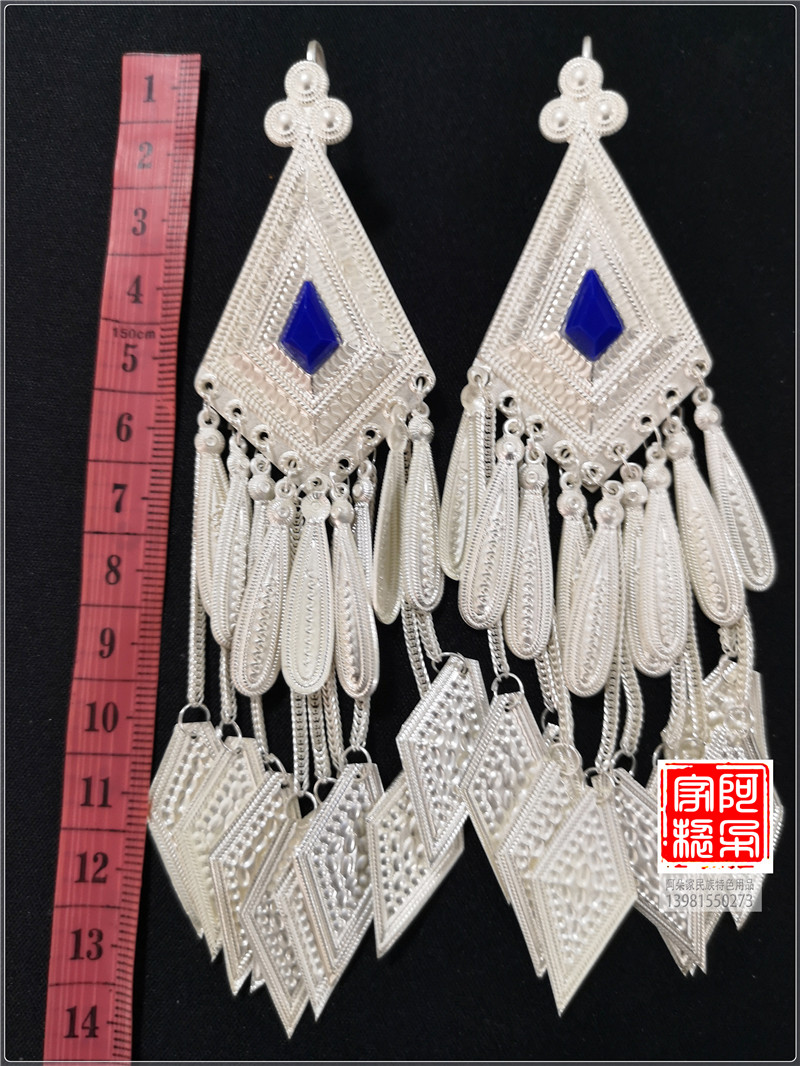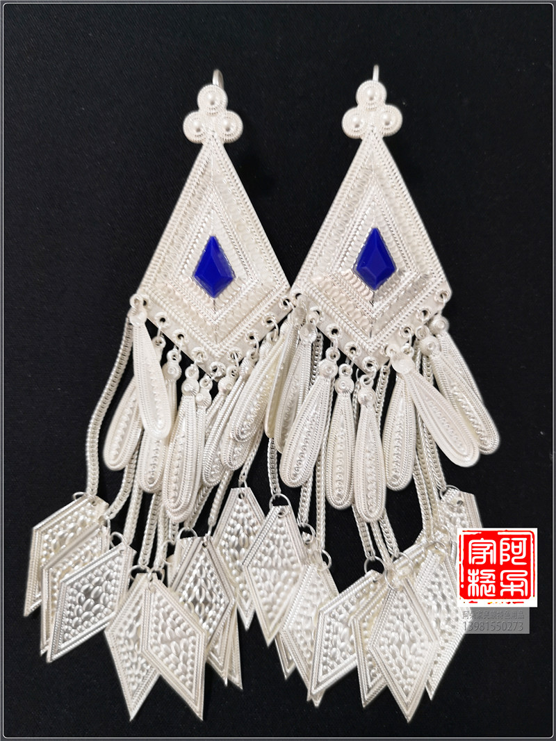 Liangshan Xichang Yi ethnic pure silver earring female rhombus traditional ethnic wind long version pure silver pure handmade jewellery