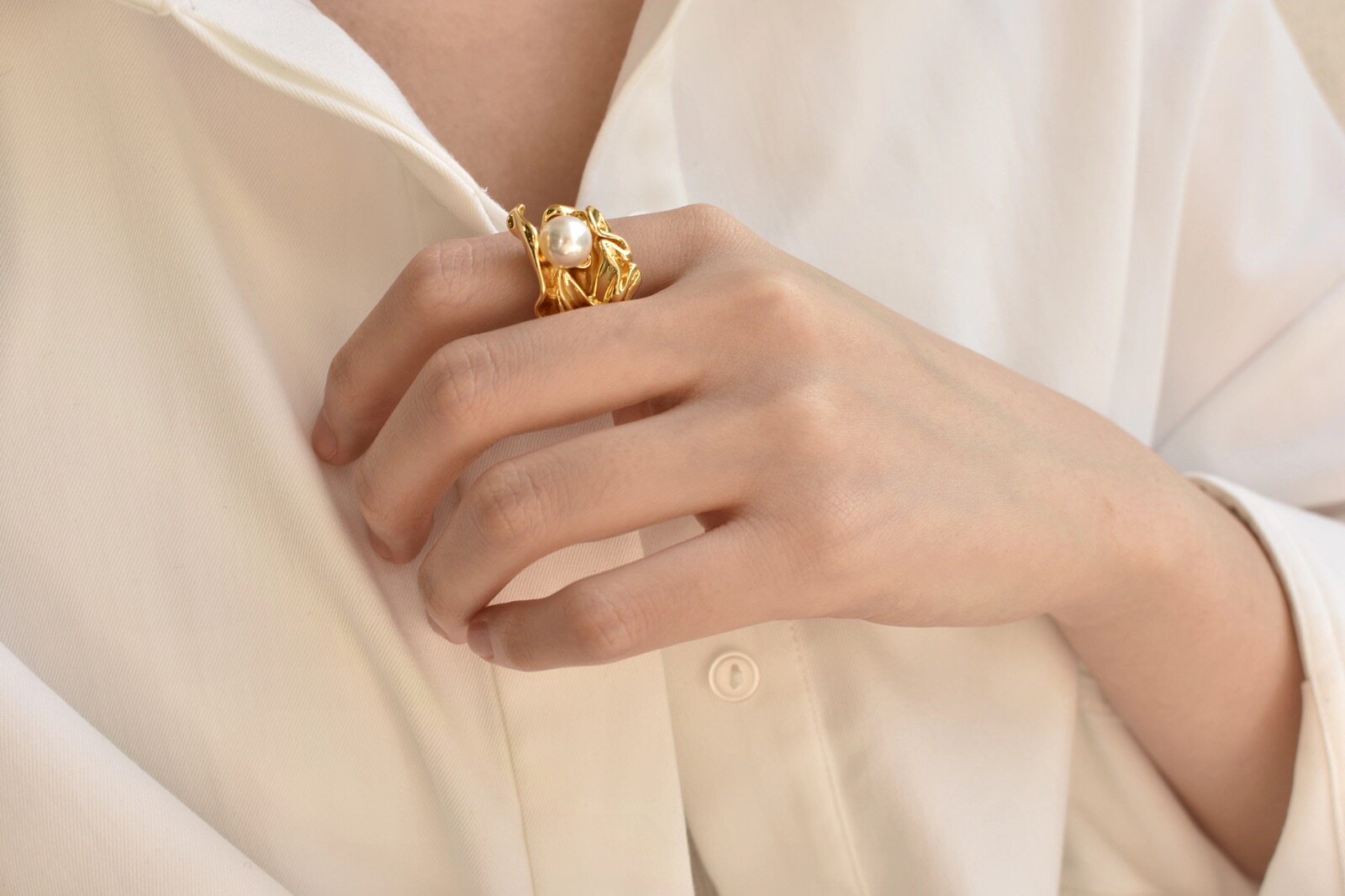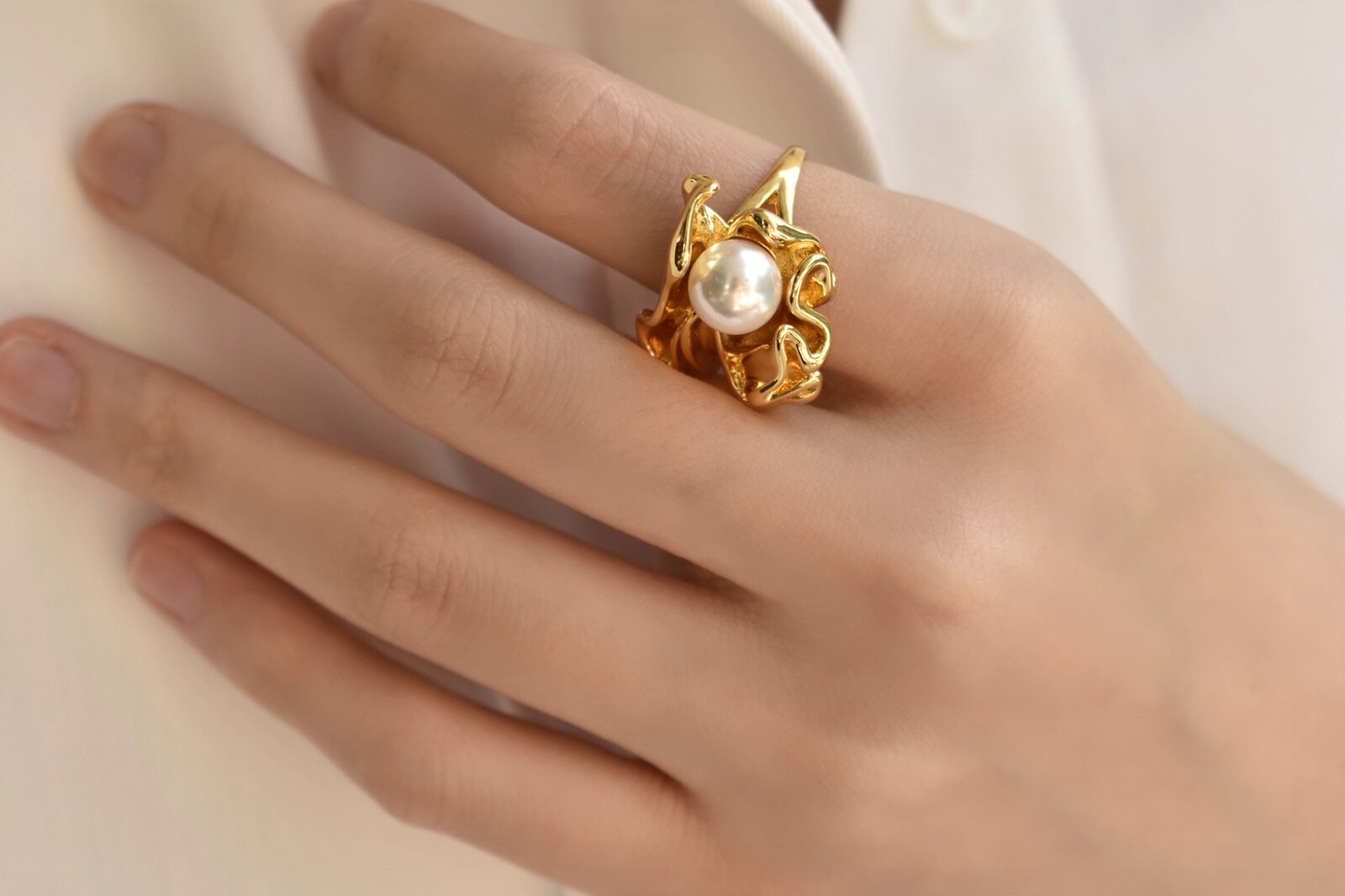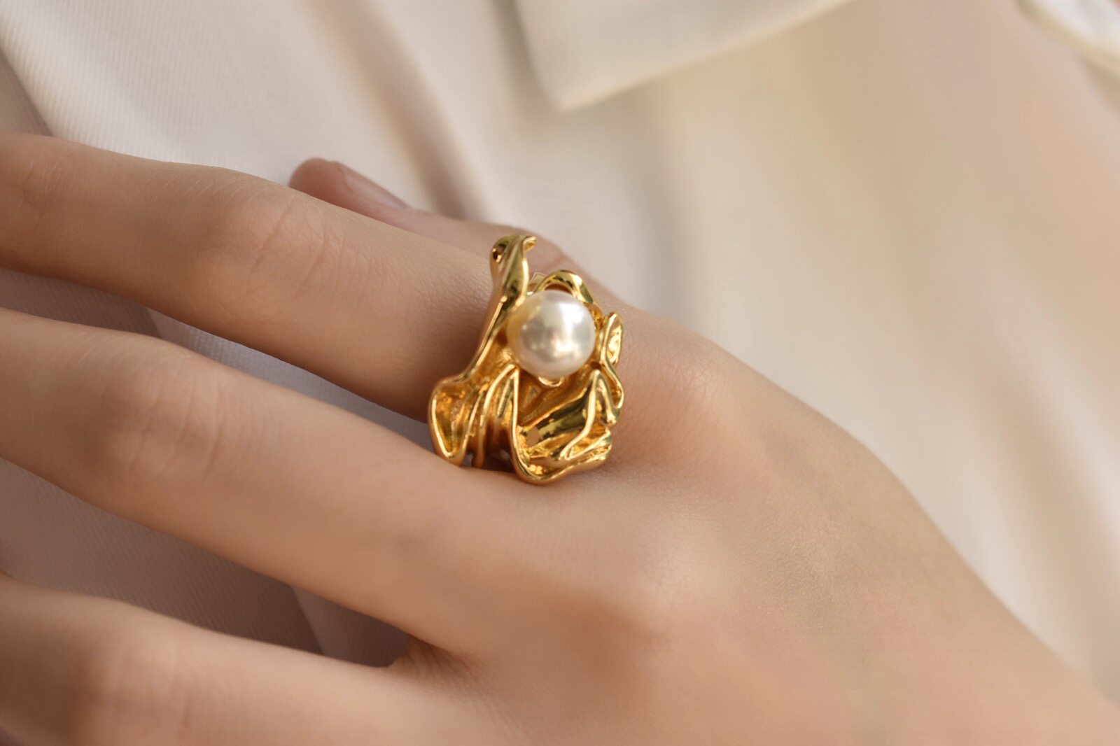 Flower pearl ring female finger European and American style niche designer Internet celebrity cold style retro fold index finger personality ins