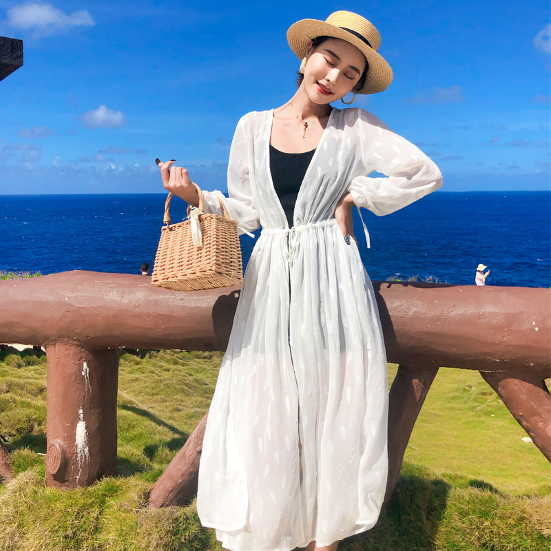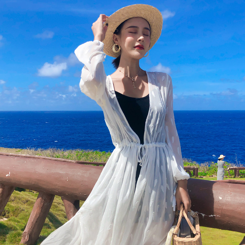 Sunscreen woman long version of beach jacket Summer long shirt white lace long sleeve seaside snow-spinning cardiovert outside