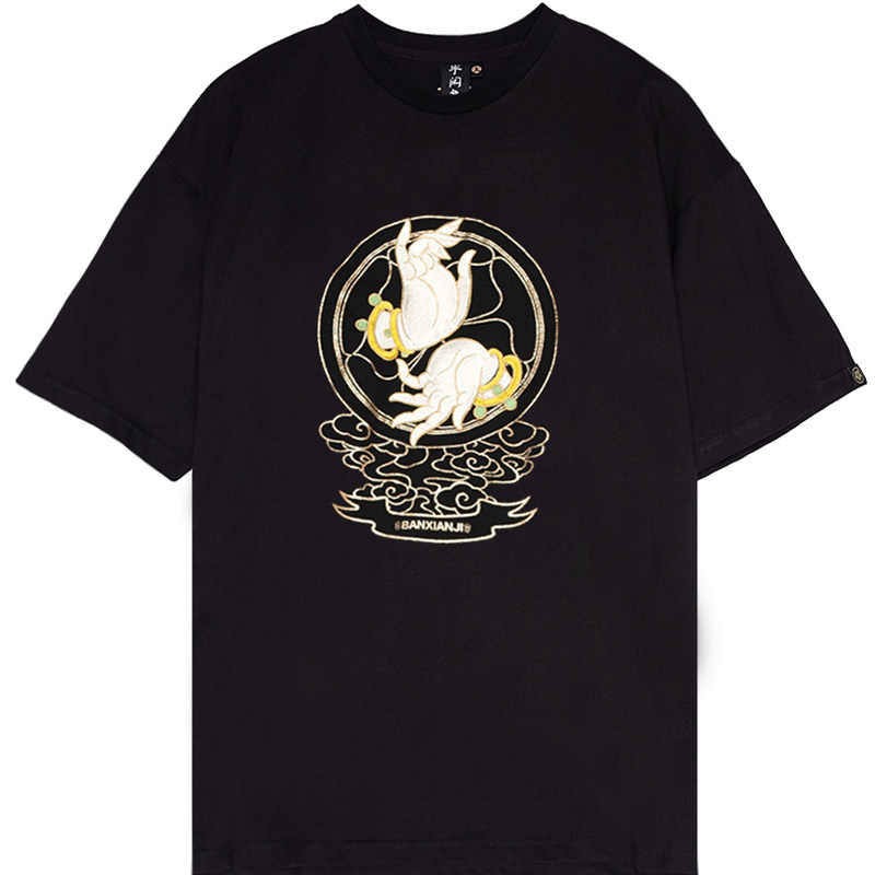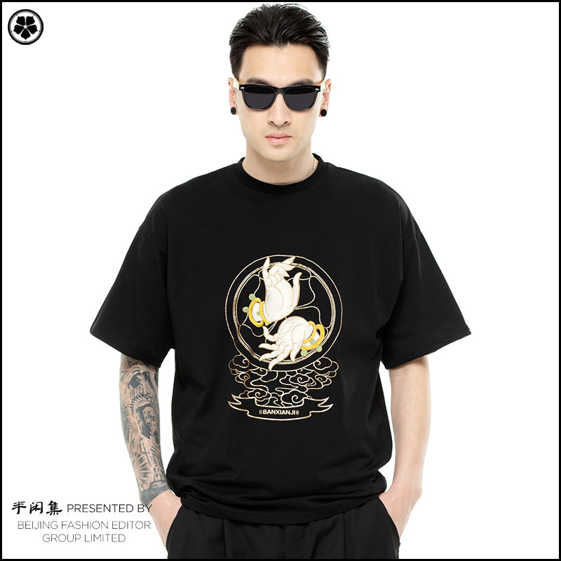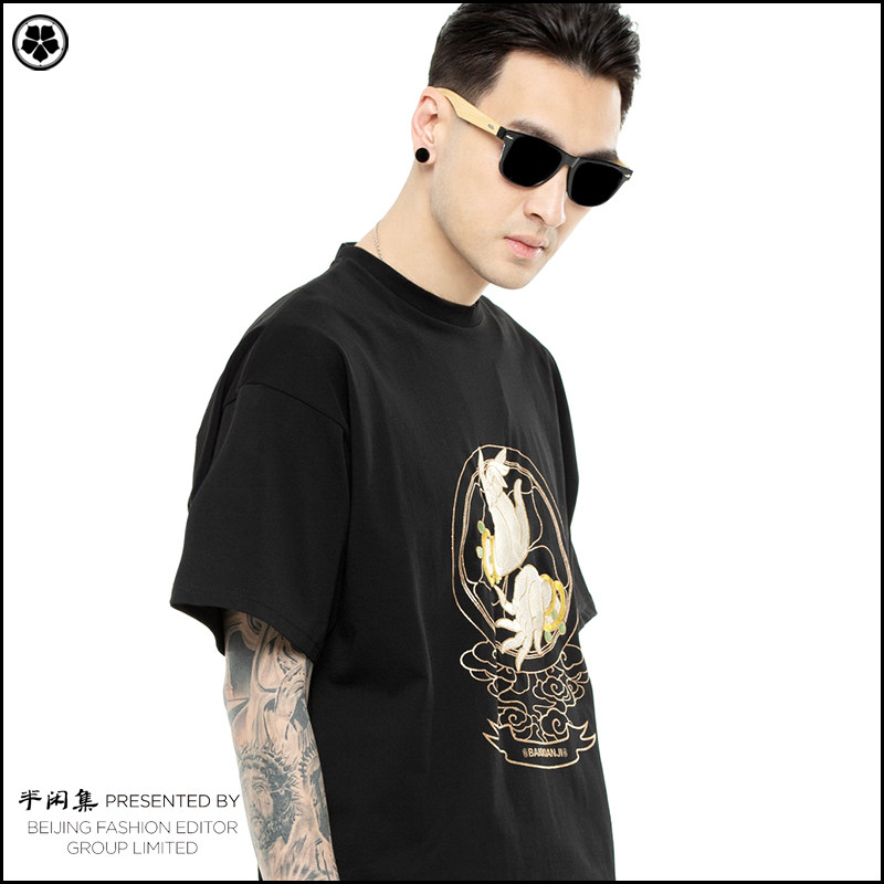 Semi - idle embroidery t - shirt Chinese Feng Buddha fashion hip hop trend round cotton menswear summer short sleeve shirt