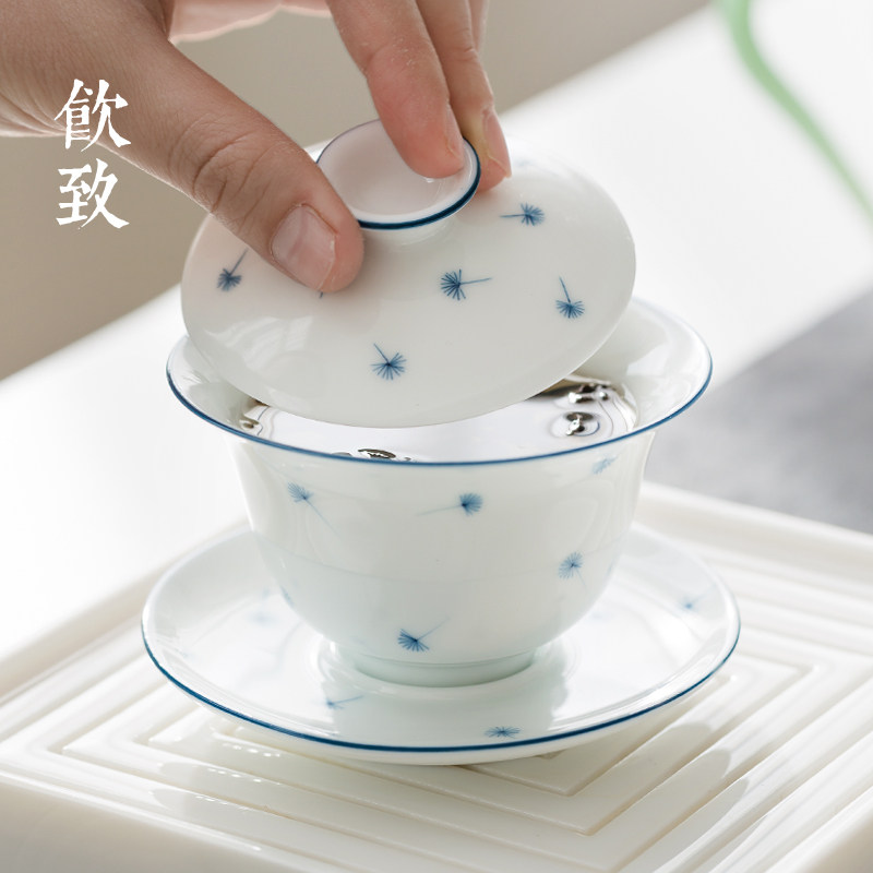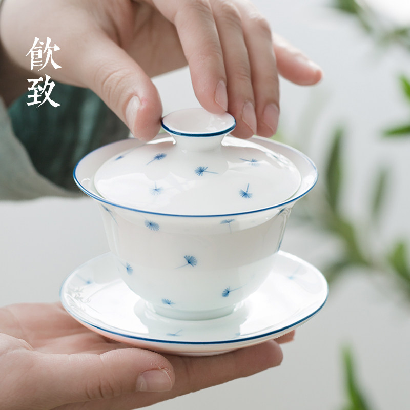 Drink to white porcelain small number three only cover bowl tea cup Jingdezhen Hand painted green flower porcelain single thin tire Kung Fu tea set high-end