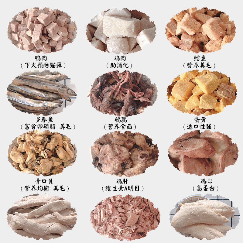 Chicken freeze-dried 10g (tried and loaded) duck meat freeze-dried 10g (tried and loaded) egg yolks 10g (tried and loaded) Chicken small breasts freeze-dried 10g (tried and loaded) duck small breasts 10g (try and eat) quail