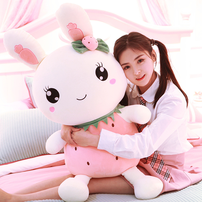 Cute plush toy rabbit doll girl sleeping in a dude bed with birthday present little white rabbit