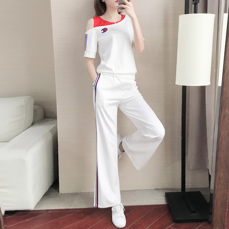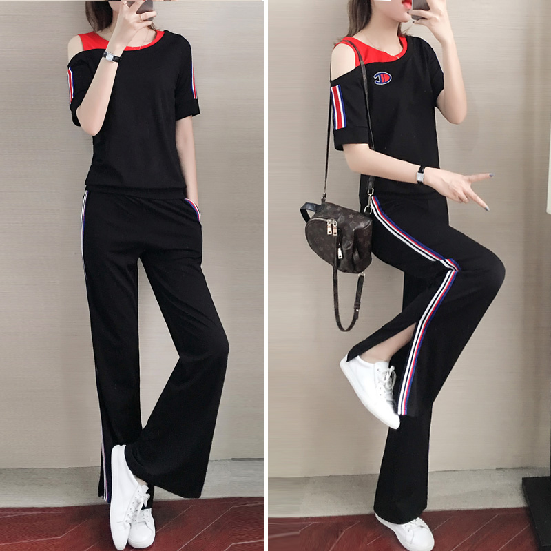 Sports suit women 2023 summer new Korean edition wide open shoulder overcoat broad legs fashion two waves