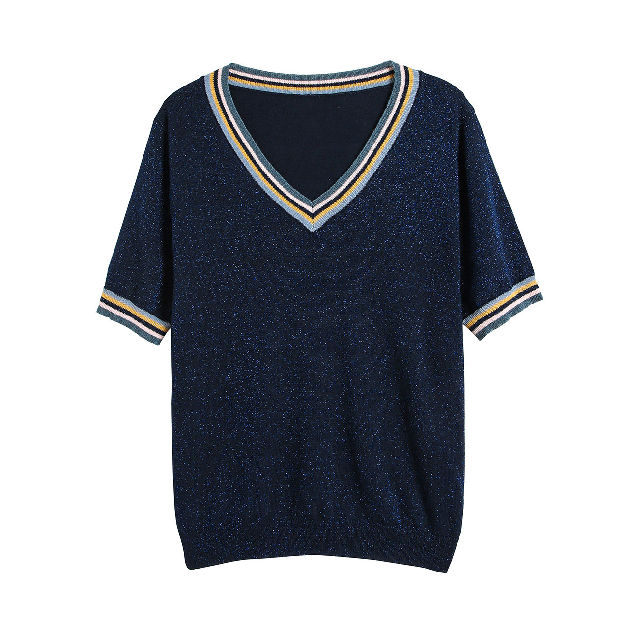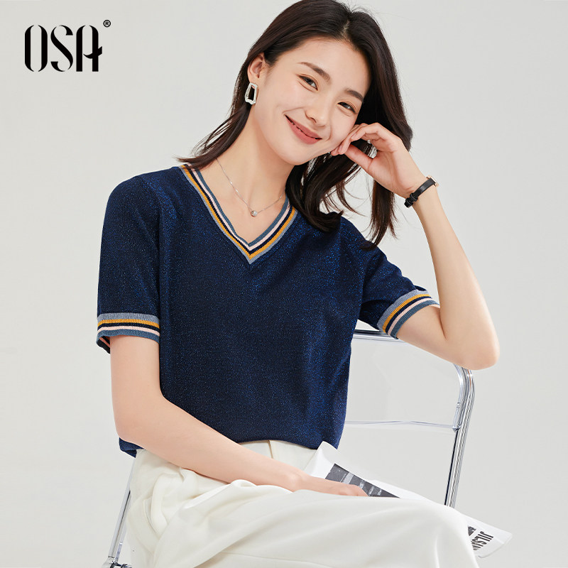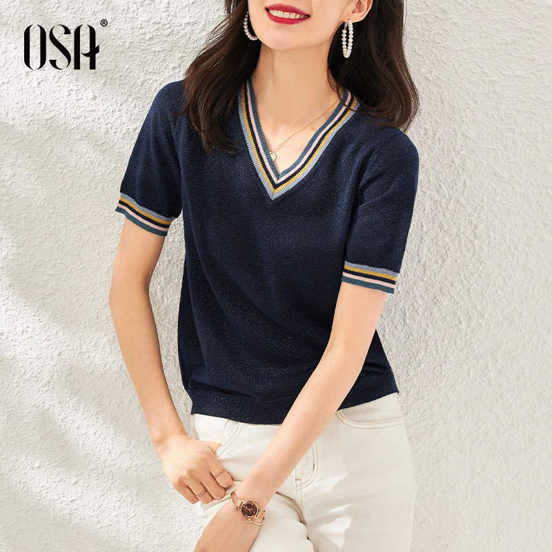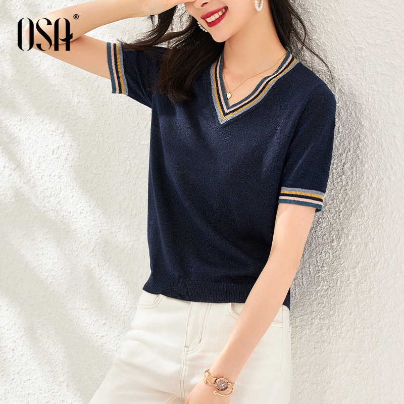 OSA Osa thin section ice silk sleeve head V-led knit cardiovert woman short sleeve summer 2022 new loose blouse shorts