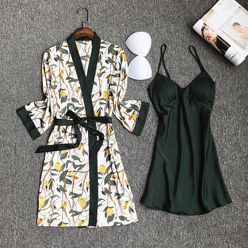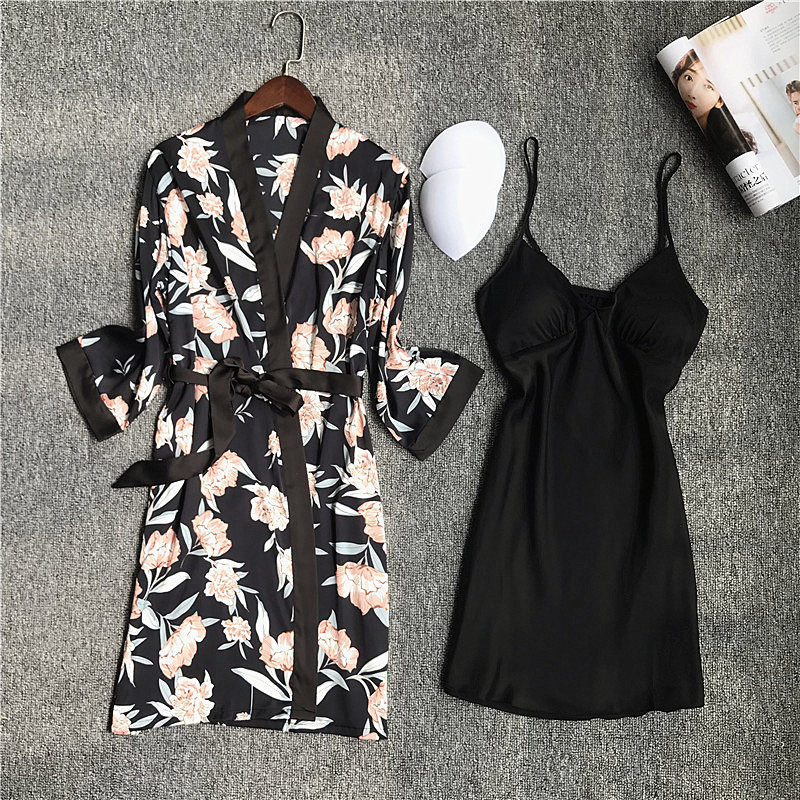 Nightdress women's sexy pajamas women's summer suspenders two-piece suit ice silk print with chest pads gathered middle sleeves can be worn outside