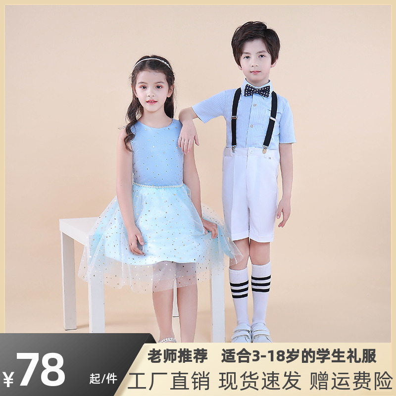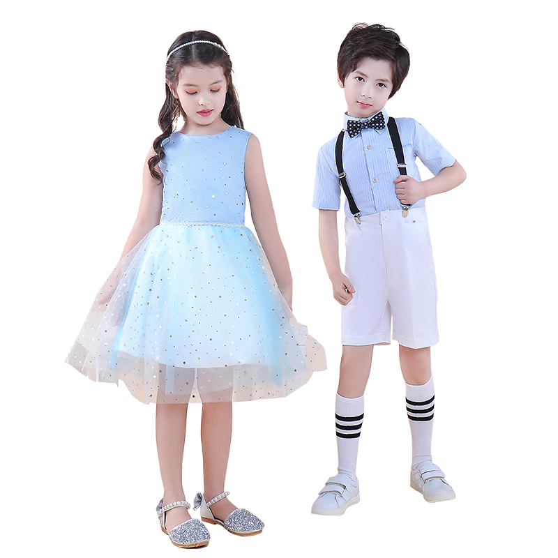 Sky blue stripes short sleeves white shorts Black straps Little white flowers tie 4 pieces in socks Girls Sky blue princess sleeveless sky blue stripes male 4 pieces (short sleeve shirt shorts knife