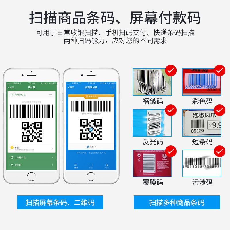 (Normal version Cost-effective) Automatic sleep Fill light is not dazzling (upgraded version high performance black) scanning performance upgrade (fashion version) appearance looks good (T25 wireless version) black (T25 wireless version) white (supermarket version) simple design (P61 voice version) Welcome to use Alipay WeChat (P60 high-speed version) wide scanning port Sensitive recognition (this do not shoot) scan one QR code commodity code payment code electronic social security health card, etc. Double warehouse delivery 30 days free trial (this do not shoot)