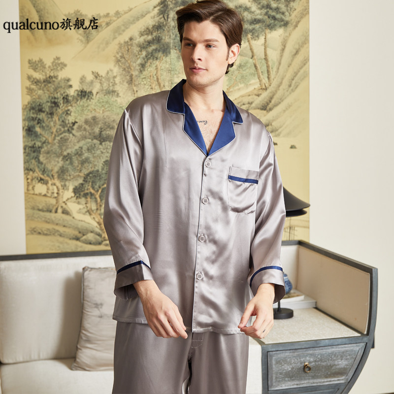 qualcuno men's silk pajamas spring and summer long-sleeved trousers silk suit Heavy mulberry silk home wear Autumn
