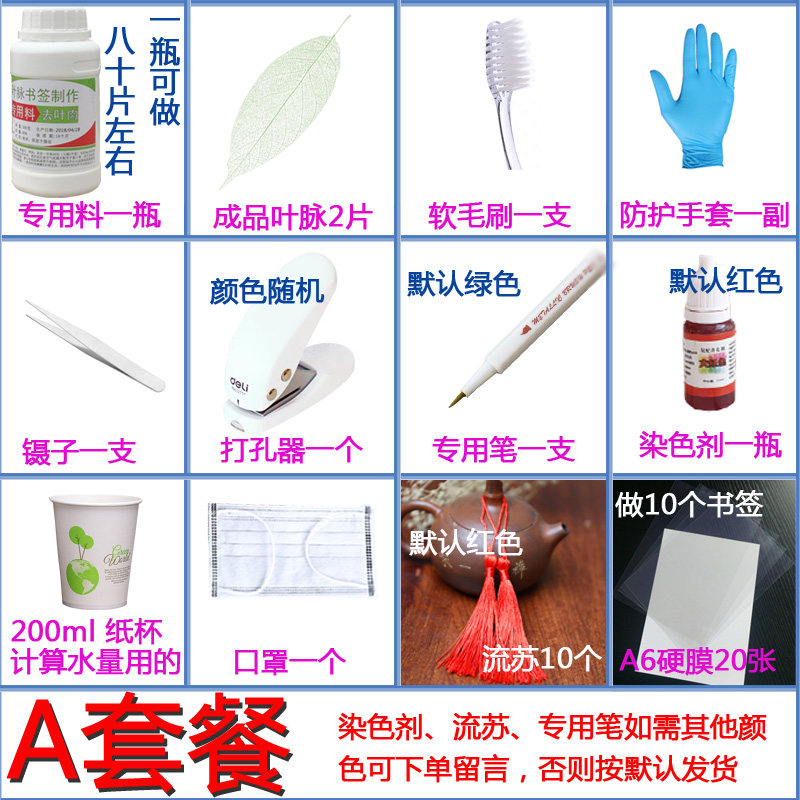Red, yellow, blue, powder, green hair dye, 1 bottle of 500ml leaf vein making solution, 20 sheets of A5 dural punch, tassel, 5 special pens, 1 glove, 1 pair of soft brushes, 1 self-cooking set A semi-finished product