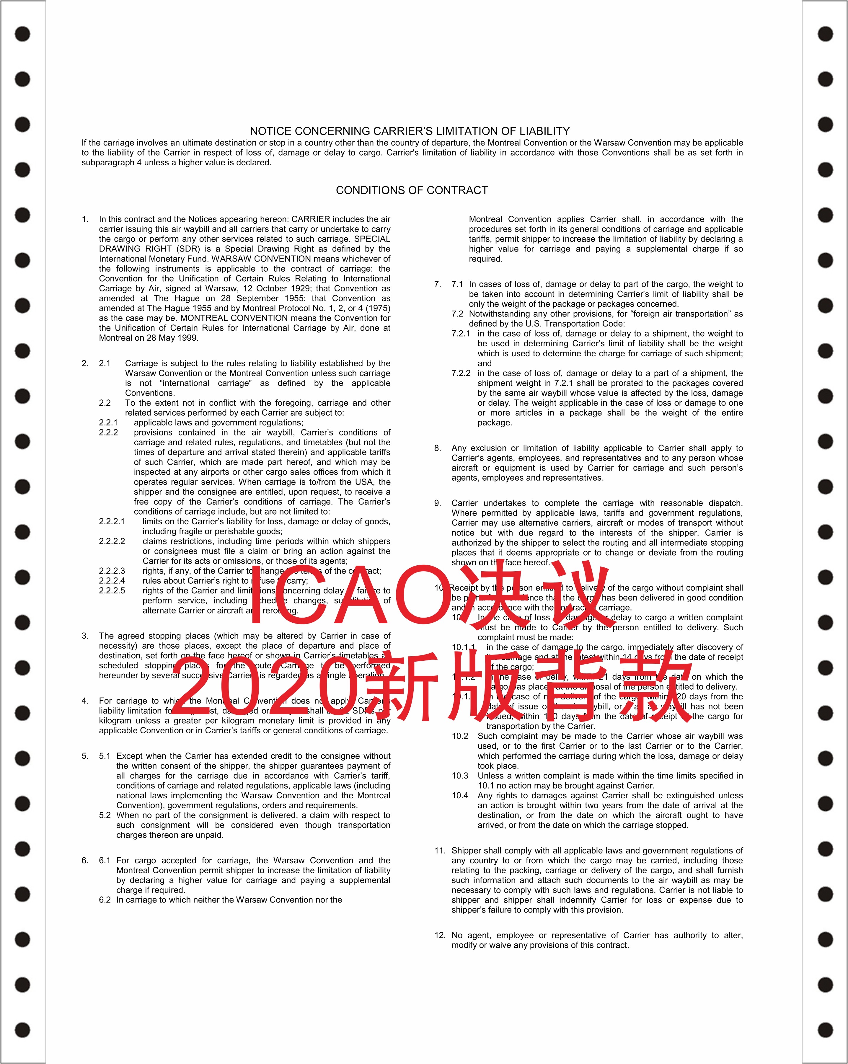 International Air Transport Bill of Lading 12 Union Medium Waybill 2020 New Edition Back