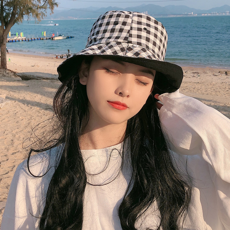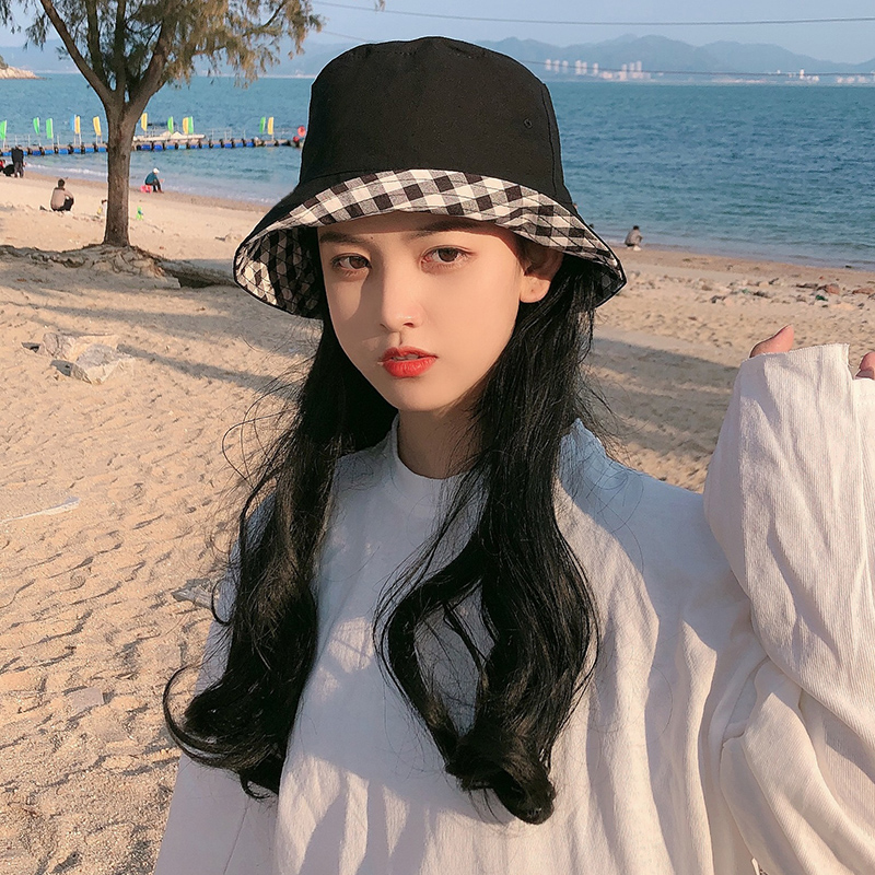 Double sided wearing grid fisherman hat female Korean version Summer great peak pelvic hat 100 lap day tying sunscreen sunscreen sunscreen