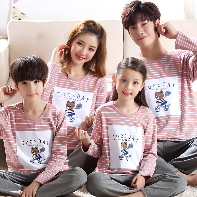 Spring Autumn Season Pajamas a family of three pure cotton long sleeve cartoon home dress full cotton with mother and daughter Family clothes