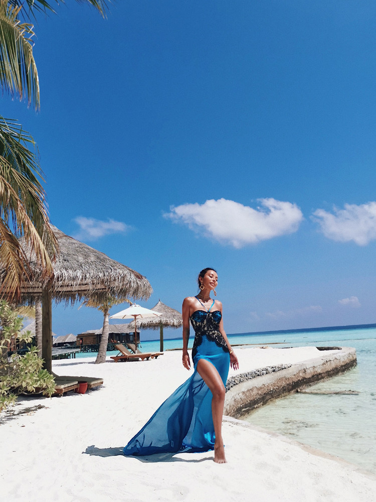 Island vacation travel Super long Sexy High Split Lace mopping long dress Dress Royal Blue Satin LMGB-20