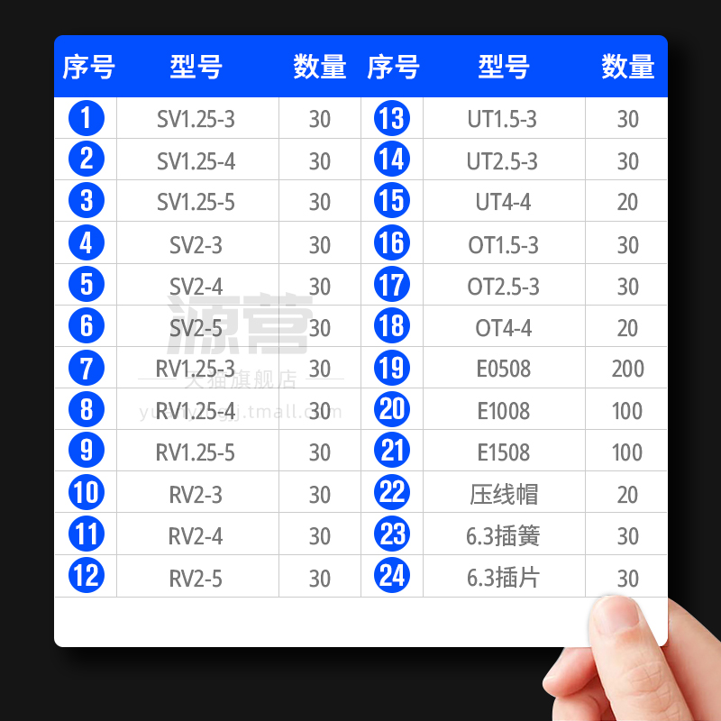 24 combinations 1000pcs + tools 24 combinations 1000pcs (no tools) RV520 sets + tools SV520 kits + tools Tube type 960 + tools Copper tubes 720 + tools Pure copper crimping caps 300 + tools Nylon bullet docking terminals + tools C45 inserts 320 + tools new