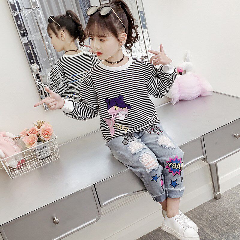 Girls bottoming shirt new long-sleeved T-shirt primary school students cartoon pullover sweater pullover spring collection striped top